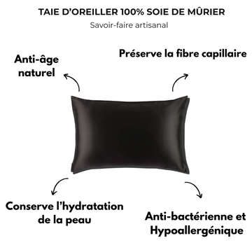 Les bienfaits de la soie et particulièrement des taies d'oreiller en soie sont nombreux : elles améliorent la santé de la peau et des cheveux, apportant douceur, hydratation et prévention des dommages.